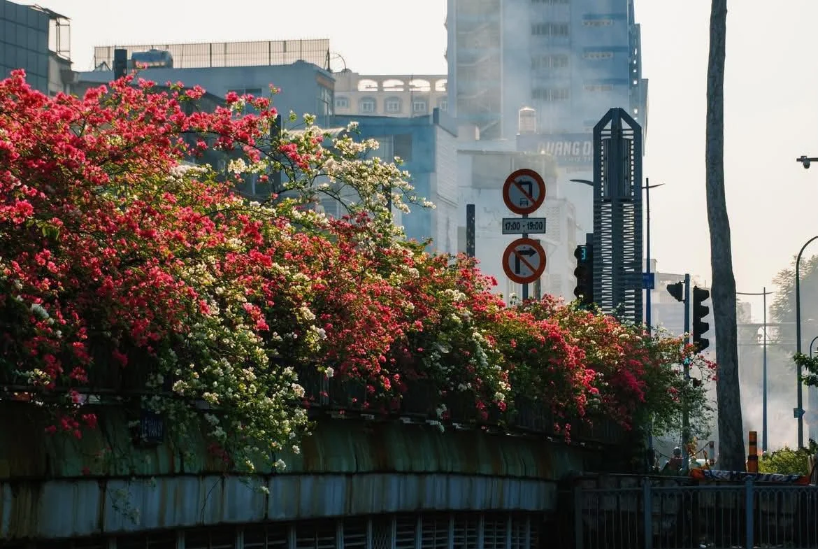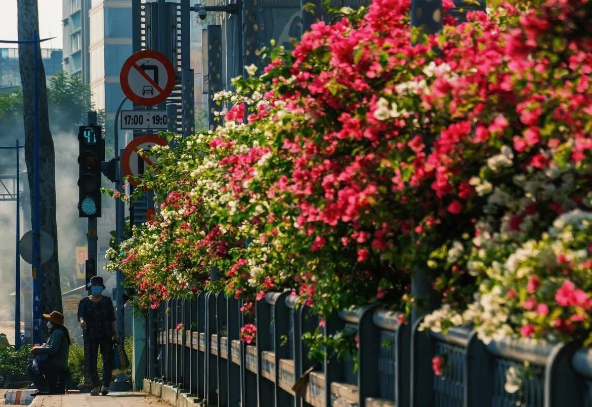 Về bố cục, loạt ảnh tận dụng triệt để đường dẫn (leading lines) từ bờ kè, lan can và dòng kênh để dẫn mắt người xem xuyên suốt khung hình. Những mảng hoa kéo dài tạo thành một “dải màu” liên tục, vừa đóng vai trò điểm nhấn, vừa là yếu tố liên kết giữa các frame.