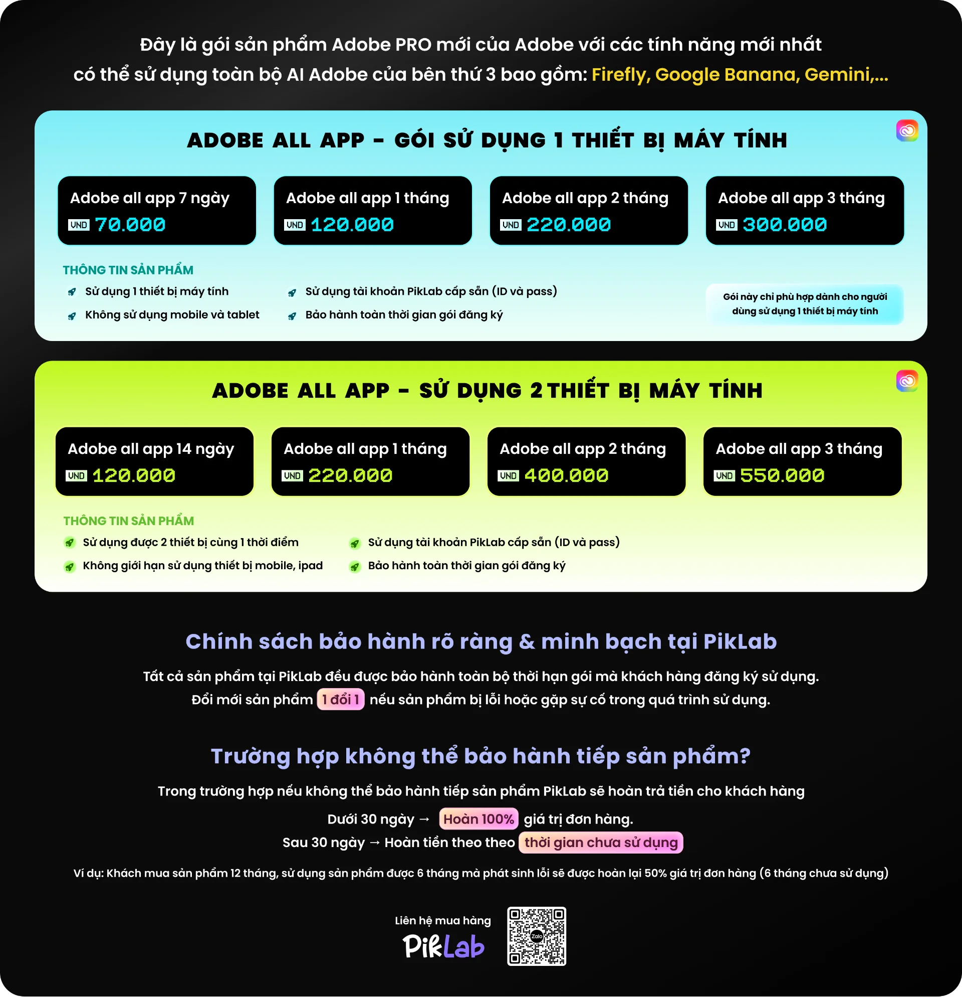 - Gói Adobe sử dụng 1 thiết bị máy tính / không giới hạn thiết bị mobile, tablet.