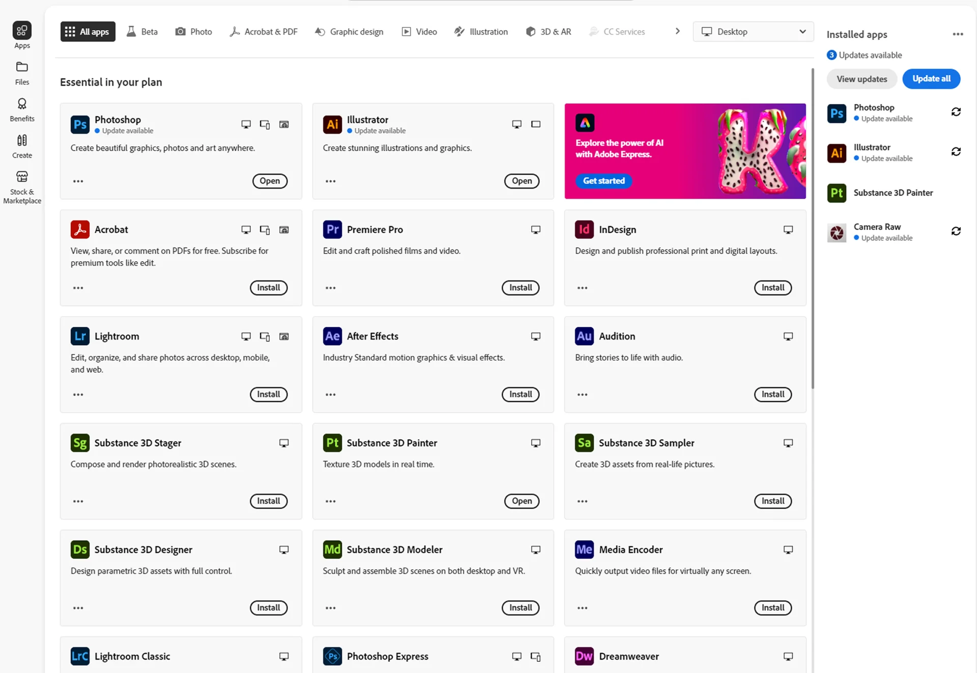 Adobe Creative Cloud All Apps bao gồm toàn bộ phần mềm Adobe khác nhau với sự liên kết chặt chẽ, có khả năng bổ trợ lẫn nhau để tạo ra các sản phẩm hoàn chỉnh.